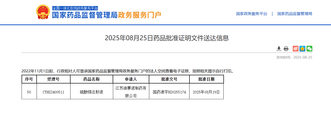 近日,mk网站_MK(中国)收到国家药品监督管理局签发的硫酸镁注射液获批信息通知,并在国家药品监督管理局政务服务门户平台公示。